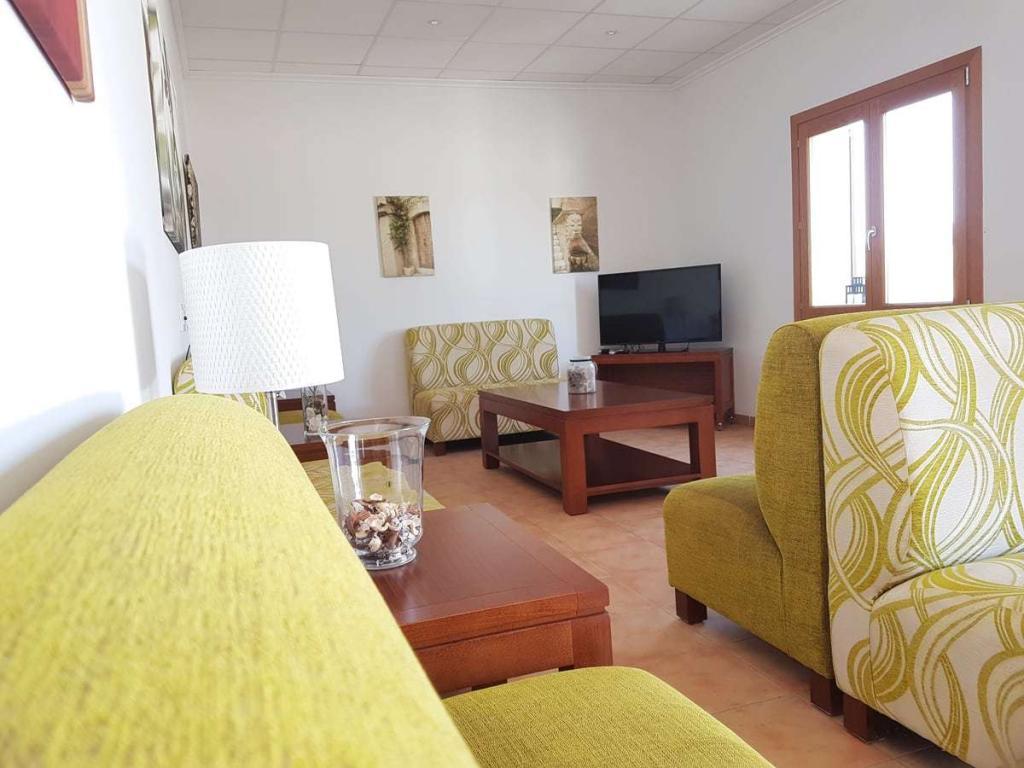 Der Wohn- und Essbereich der Finca ist bewusst großzügig angelegt. Die Sofas regen dazu an, sie flexibel umzustellen, so dass immer wieder neue Kombinationen entstehen. Eben ganz so, wie man es gerade braucht. Im Wohnzimmer steht außerdem ein Flat-TV mit deutschem und spanischem Programm.